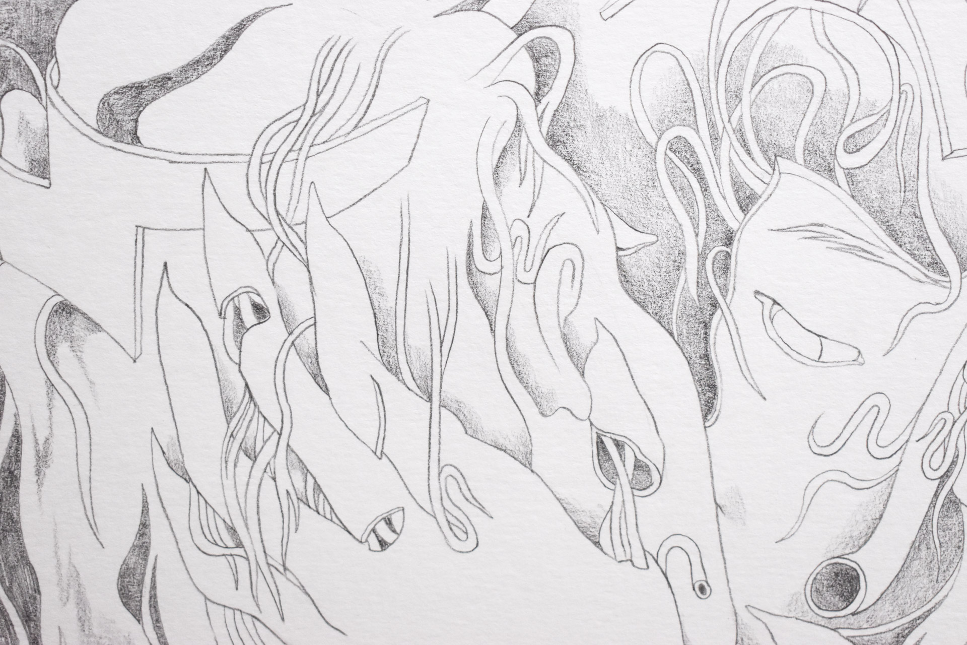 Artist Statement: Hood is an exploration of shifting interiorities via mechanical pencil on heavy vellum. The competing visual languages of biological diagrams, print ephemera tracings, and other collaged pieces are folded together in a knight's helmet. This reflective suit of armour serves as a casing for ecosystems of thought teeming beneath the surface. Scraps of text are sourced from Perfume Genius and Fiona Apple song lyrics, original writing, found poetry, as well as portions of Irum's text, on the swallow, and her belly. How many rocks harbour secret ecologies underneath? What delineates inside and outside? What separates you and I?